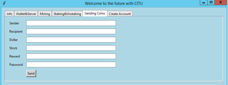 Send coins: enter SENDER, RECIPIENT, DOLLAR, STOCK and PASSWORD then submit.