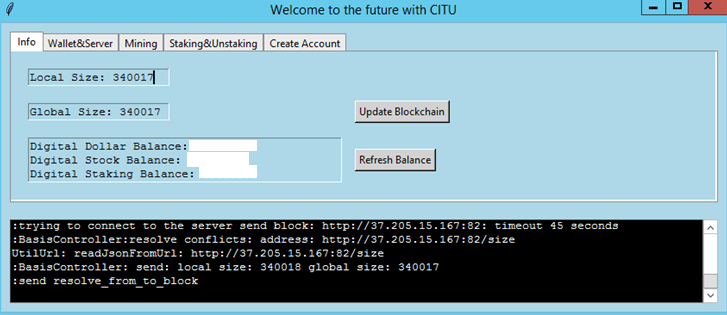 View blockchain size, global size, digital dollar, stocks and staking under "info" tab.
